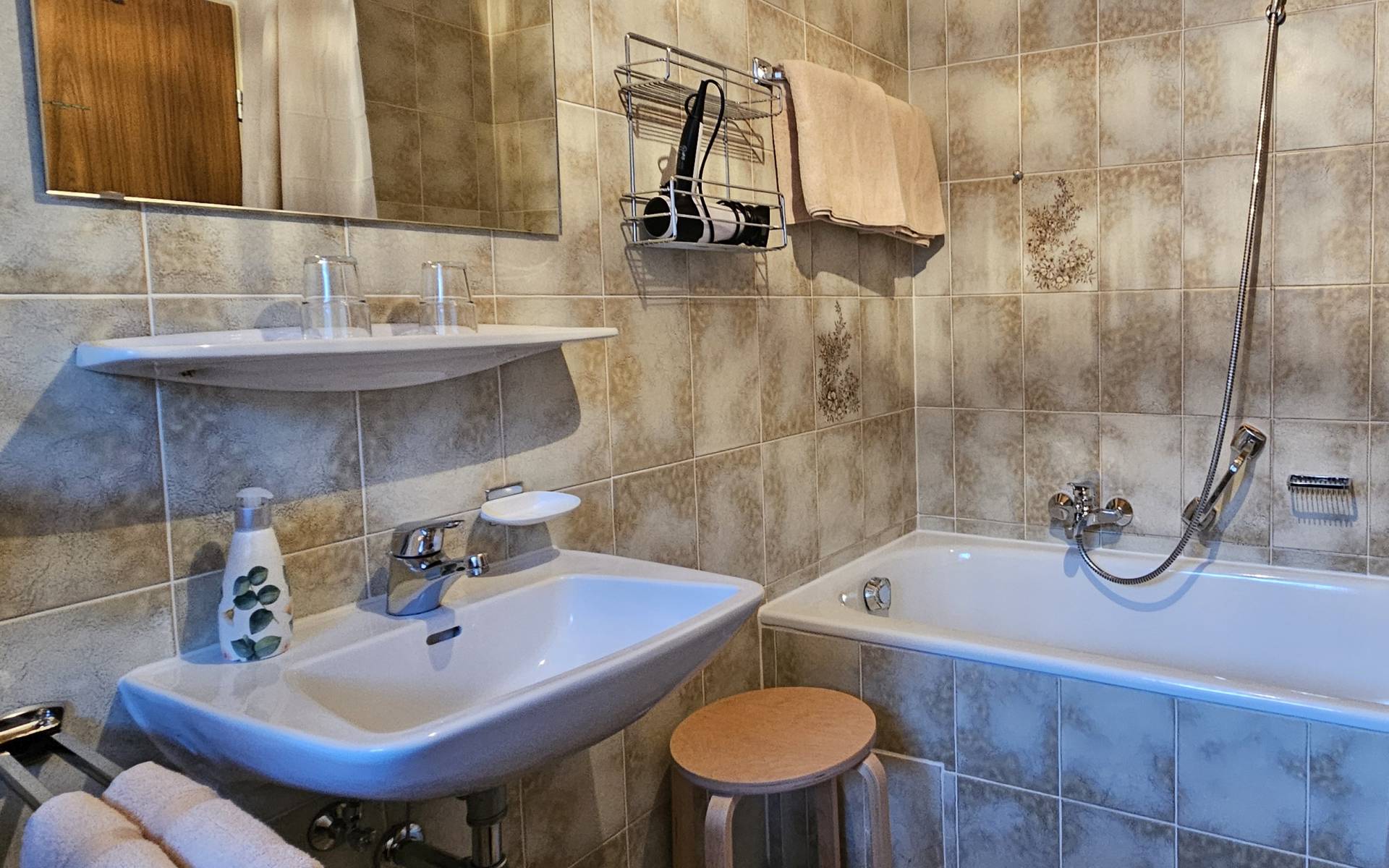 Das Bad besteht aus einer Badewanne mit Dusche und WC. Ein Haartrockner sowie Handtücher in ausreichender Anzahl stehen zur Verfügung